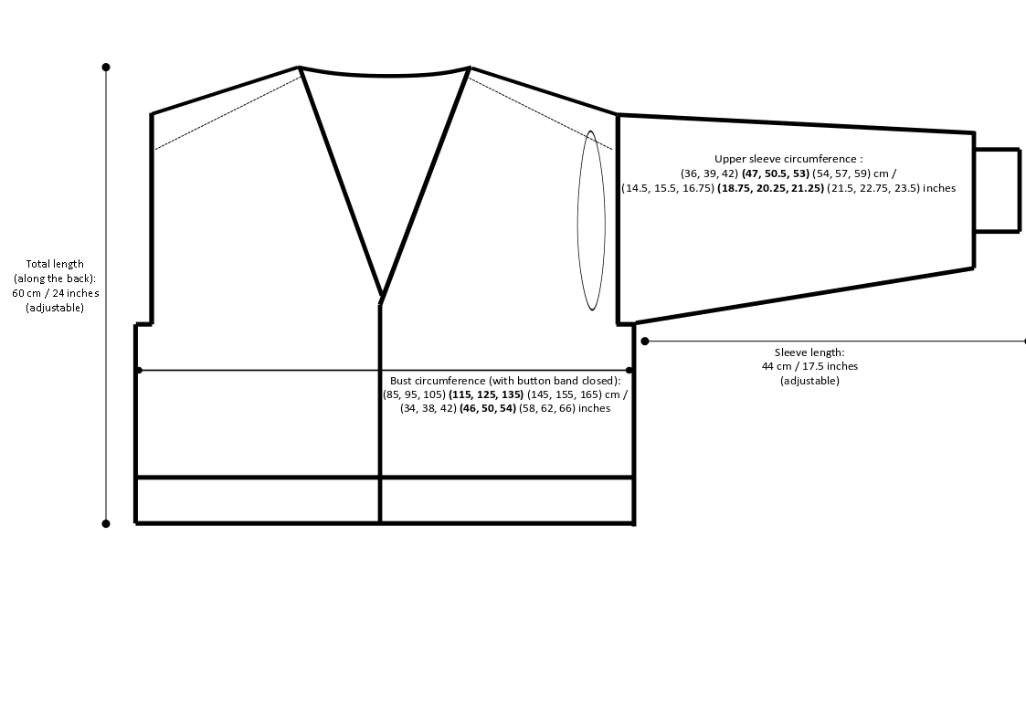 The measurements listed below are for the final cardigan after washing and blocking and with the button band closed. This pattern comes in 9 sizes (1, 2, 3) (4, 5, 6) (7, 8, 9) with finished bust circumference measuring (85, 95, 105) (115, 125, 135) (145, 155, 165) cm / (34, 38, 42) (46, 50, 54) (58, 62, 66)