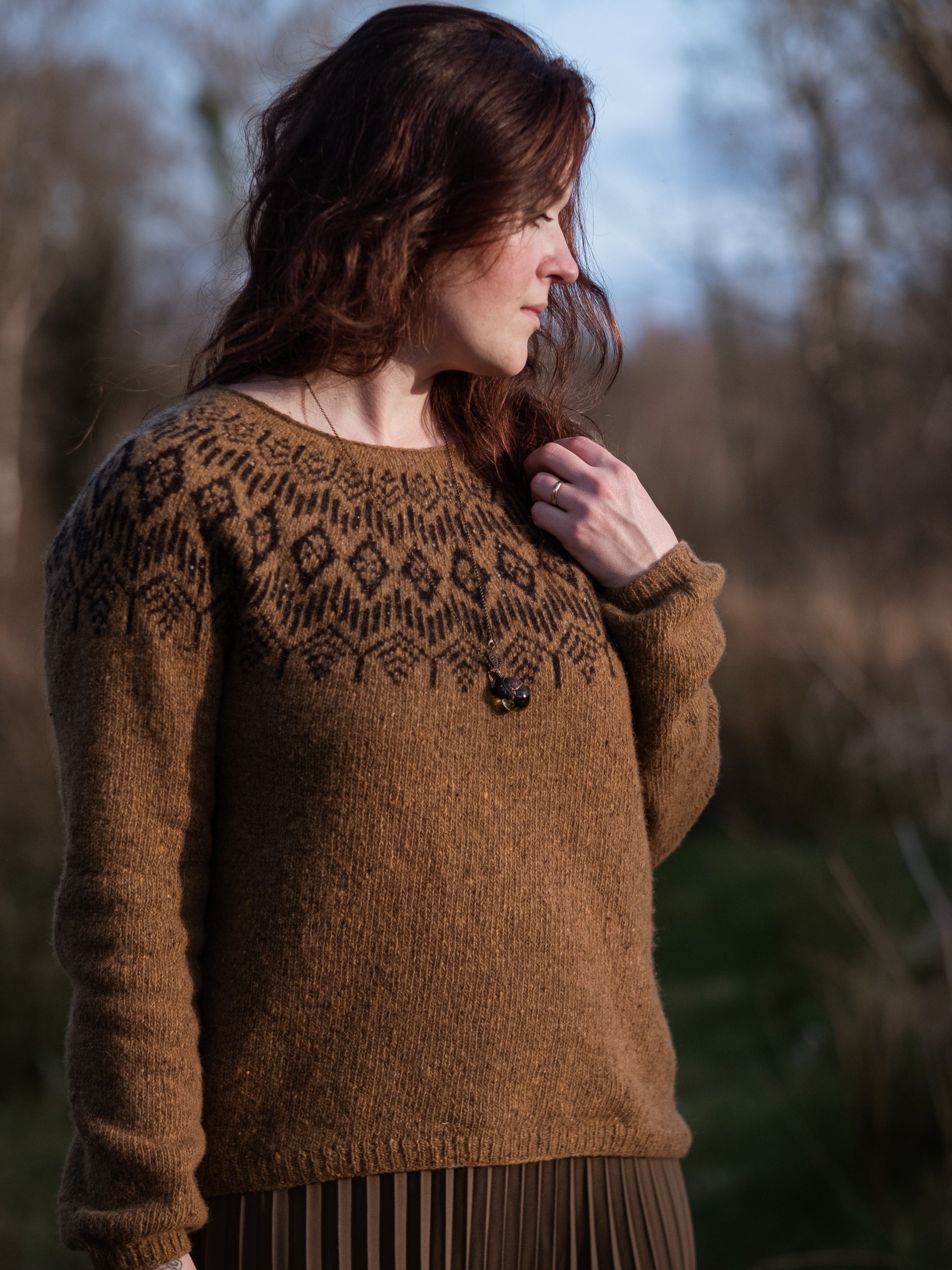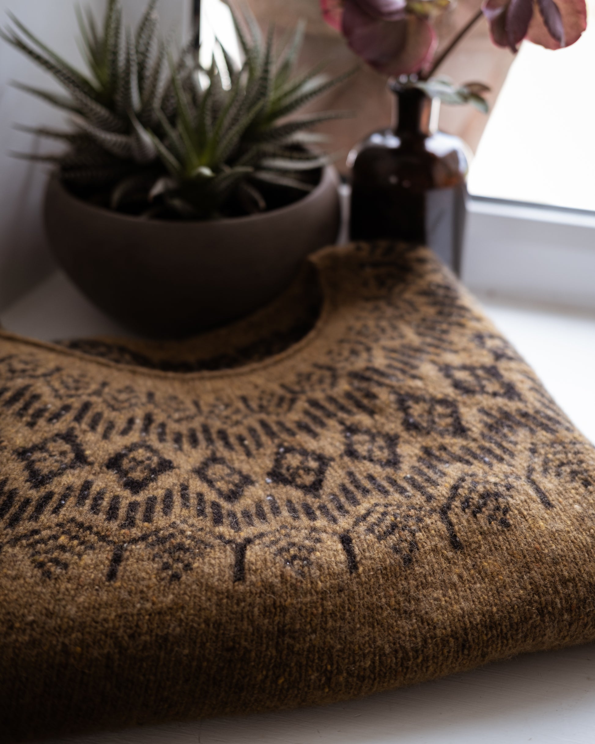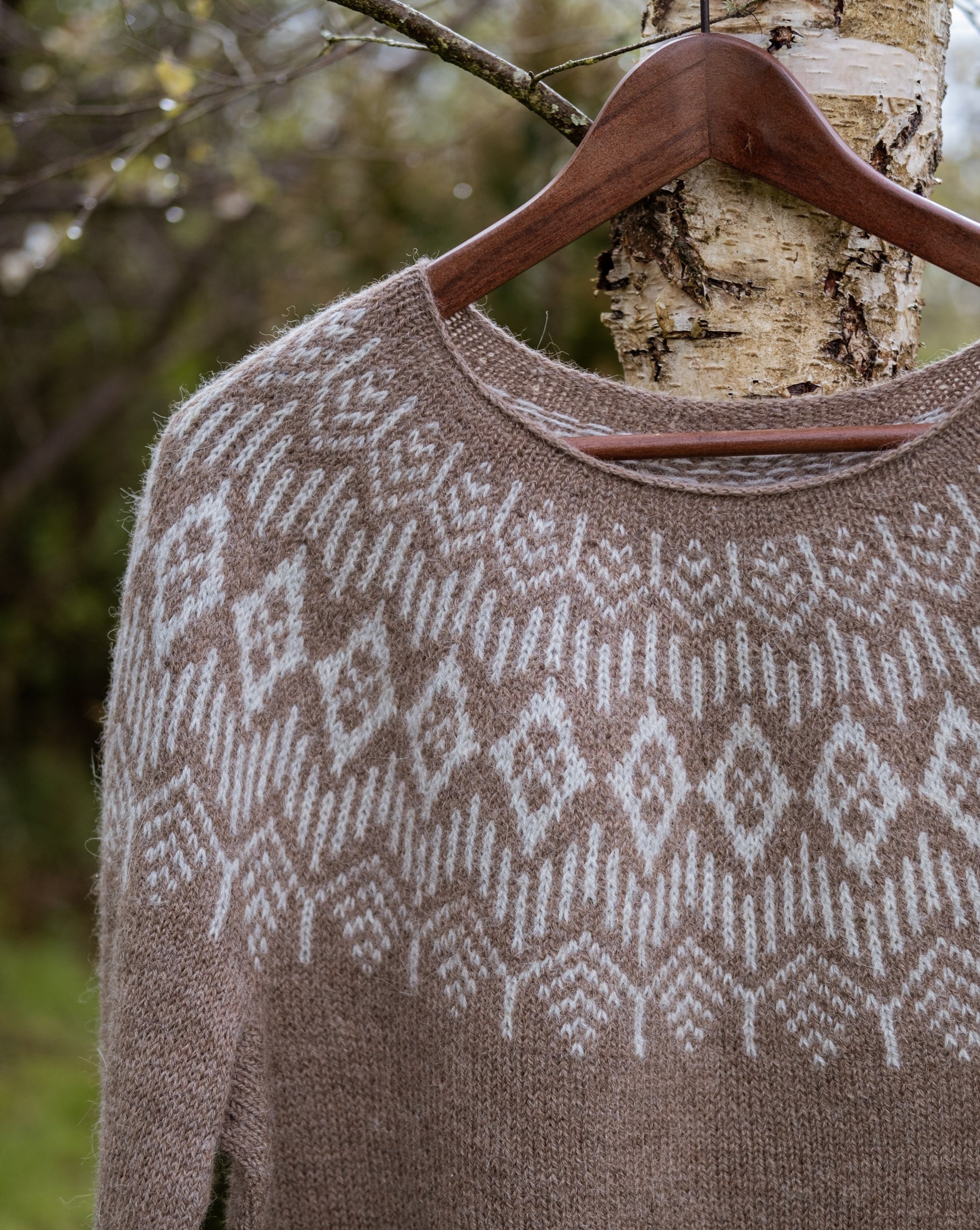 ASTRA is a stranded colourwork sweater with a top-down construction. Starting with the neck, the sweater is worked seamlessly top down, using short rows to shape neckline. The increases of the yoke are done using M1L and M1R methods.