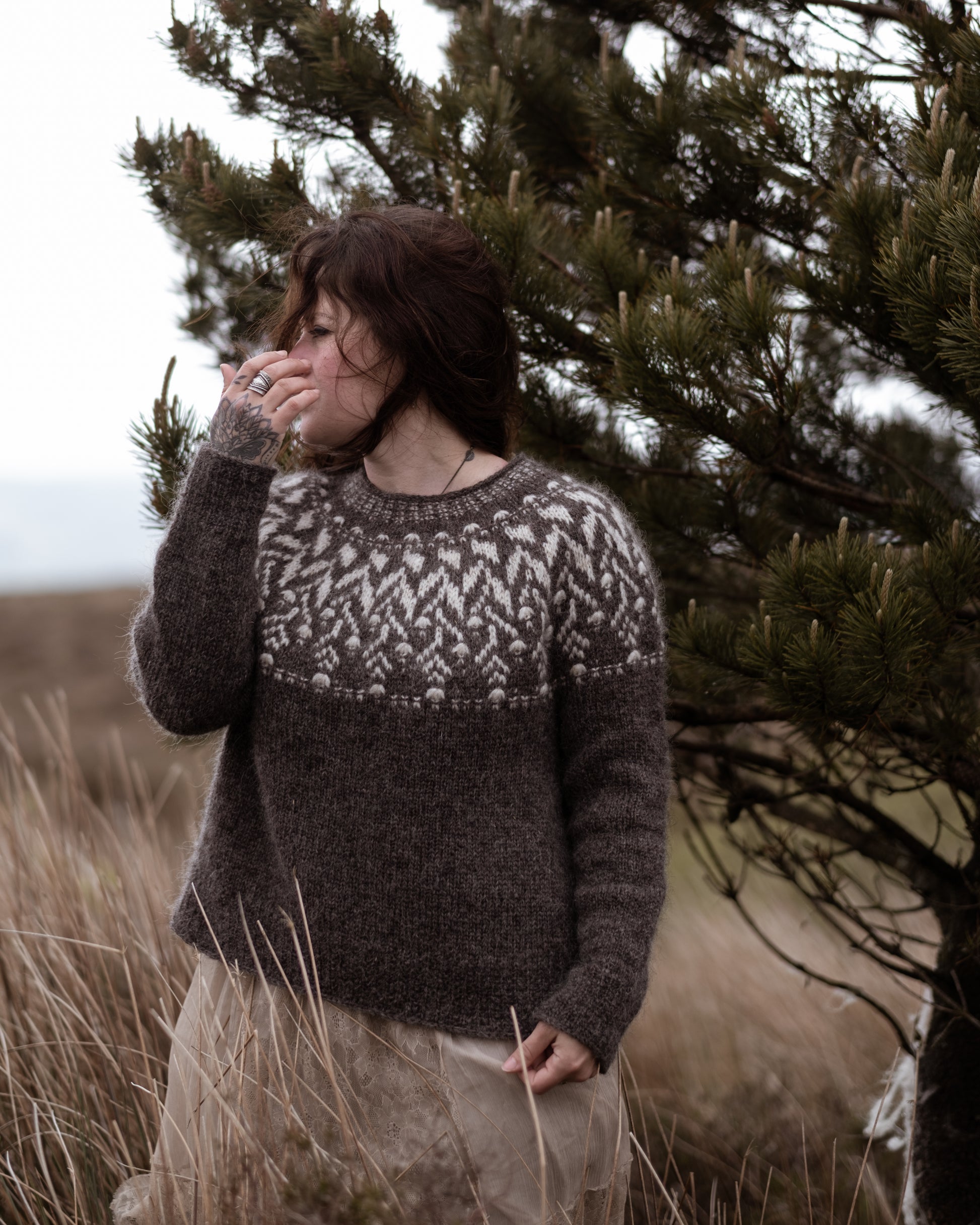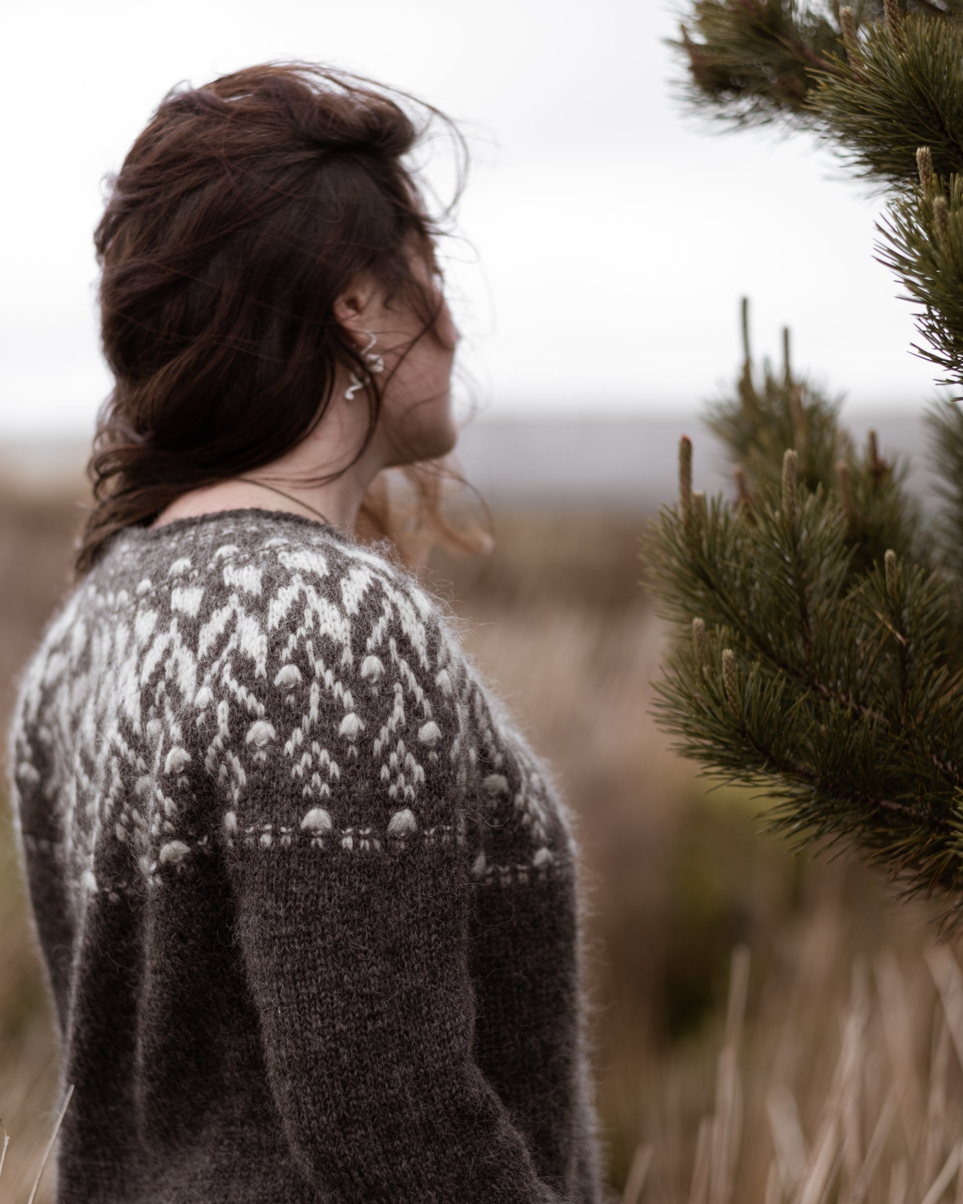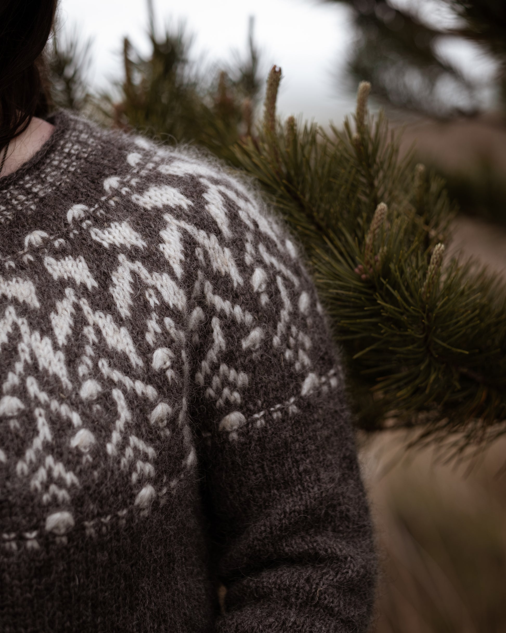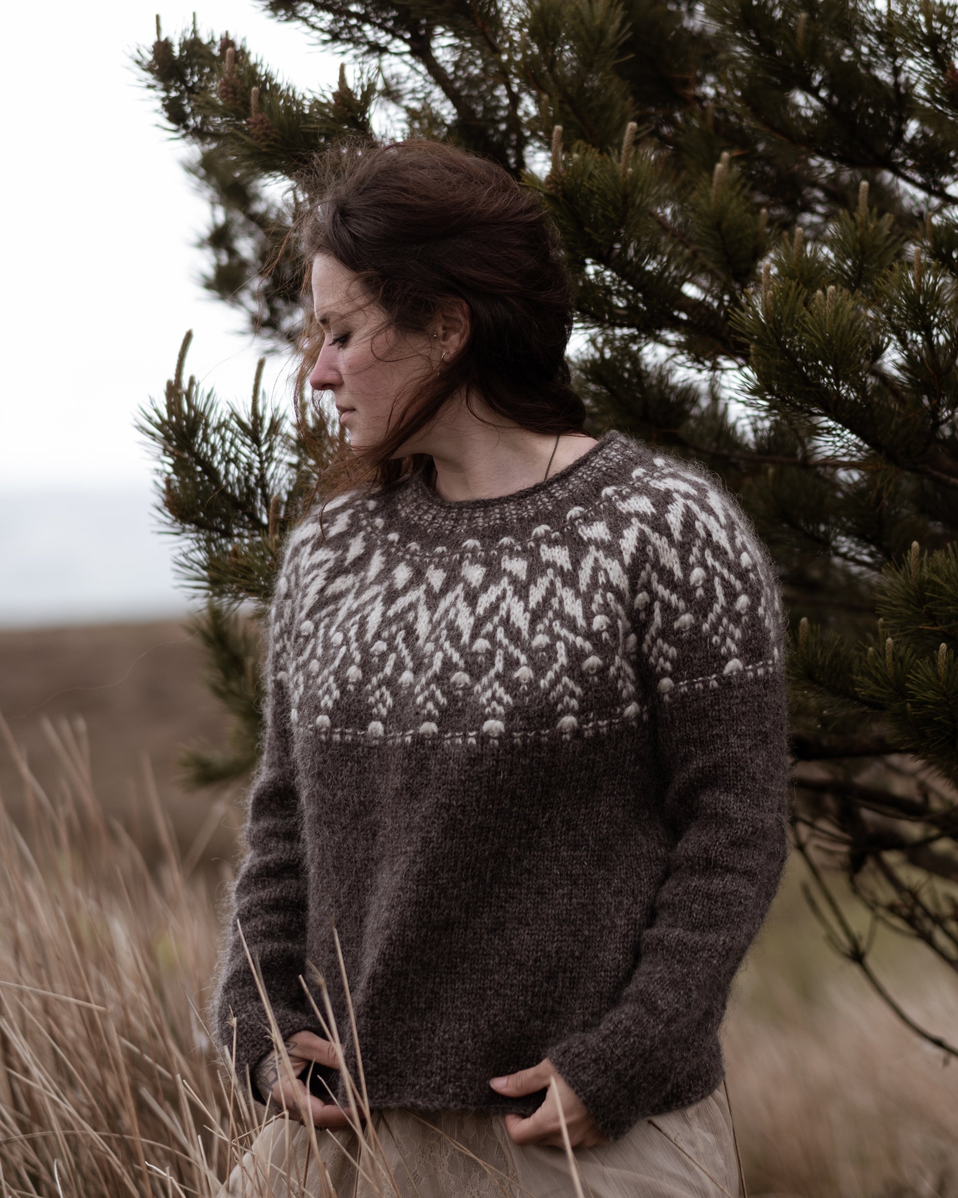 FROST FLOWERS is a stranded colourwork sweater with a top-down construction and a round yoke. Starting with the neck, the sweater is worked seamlessly top down. After the colourwork yoke, short rows are worked to shape the neckline and then the body and sleeves are separated while casting on stitches for underarms.
