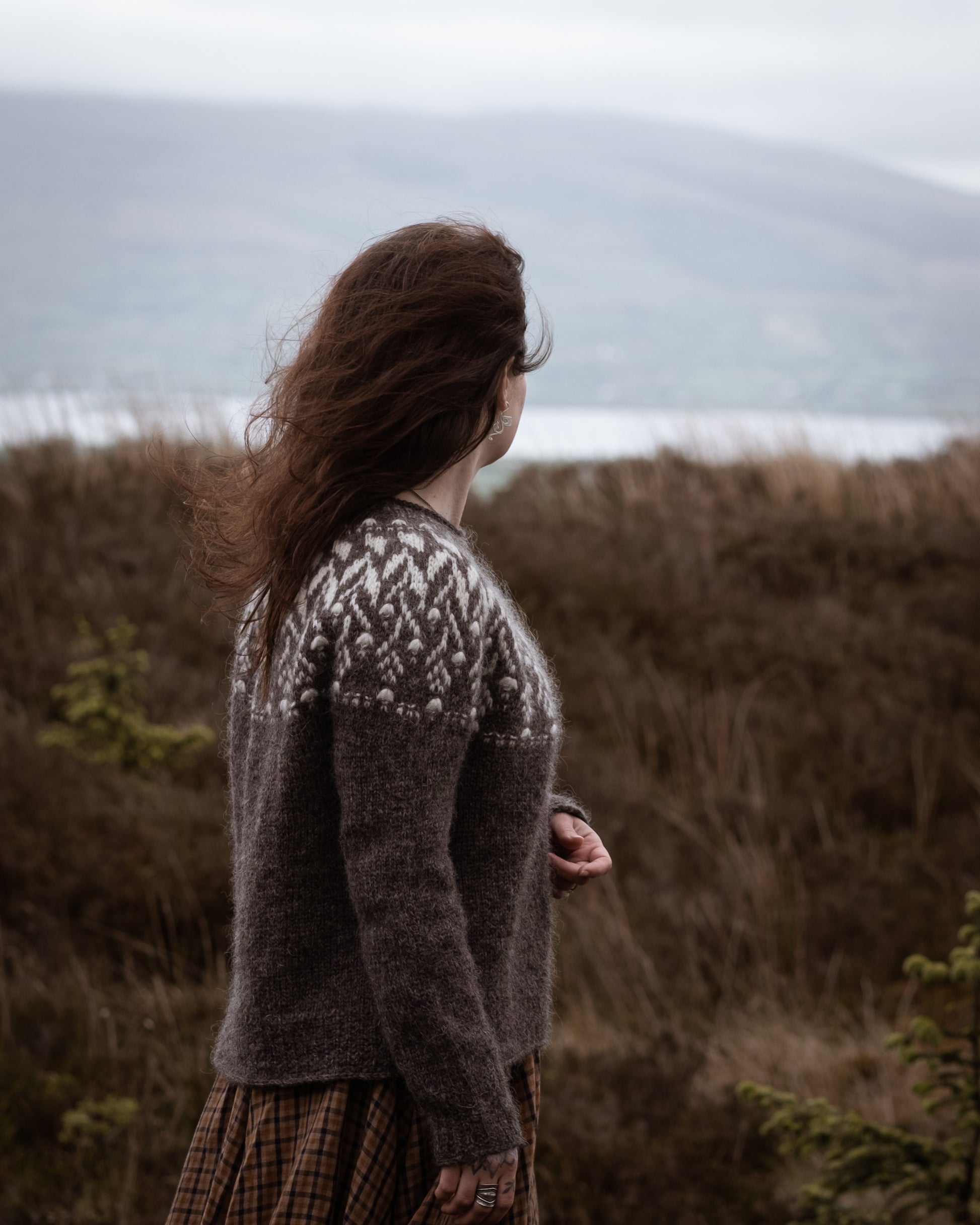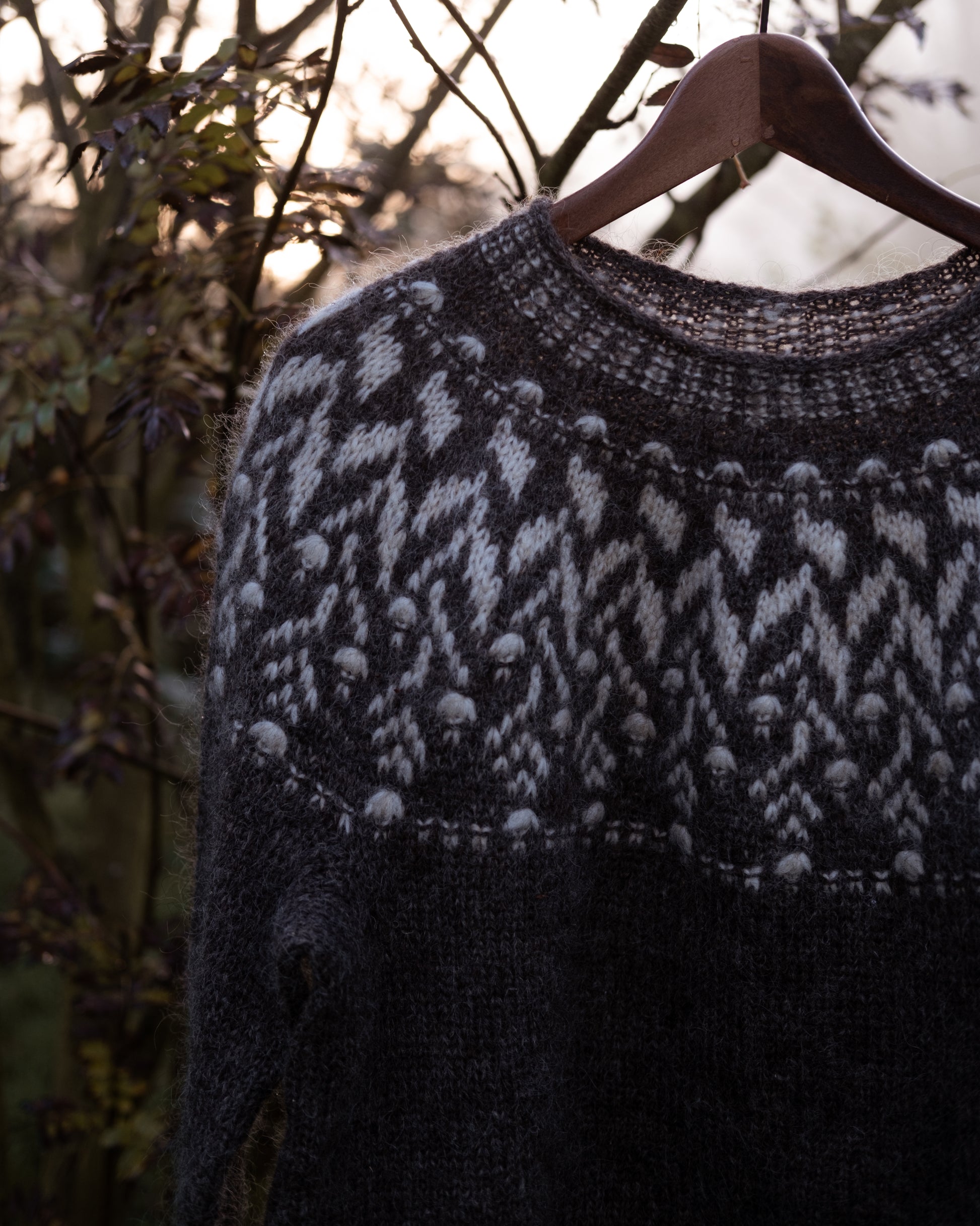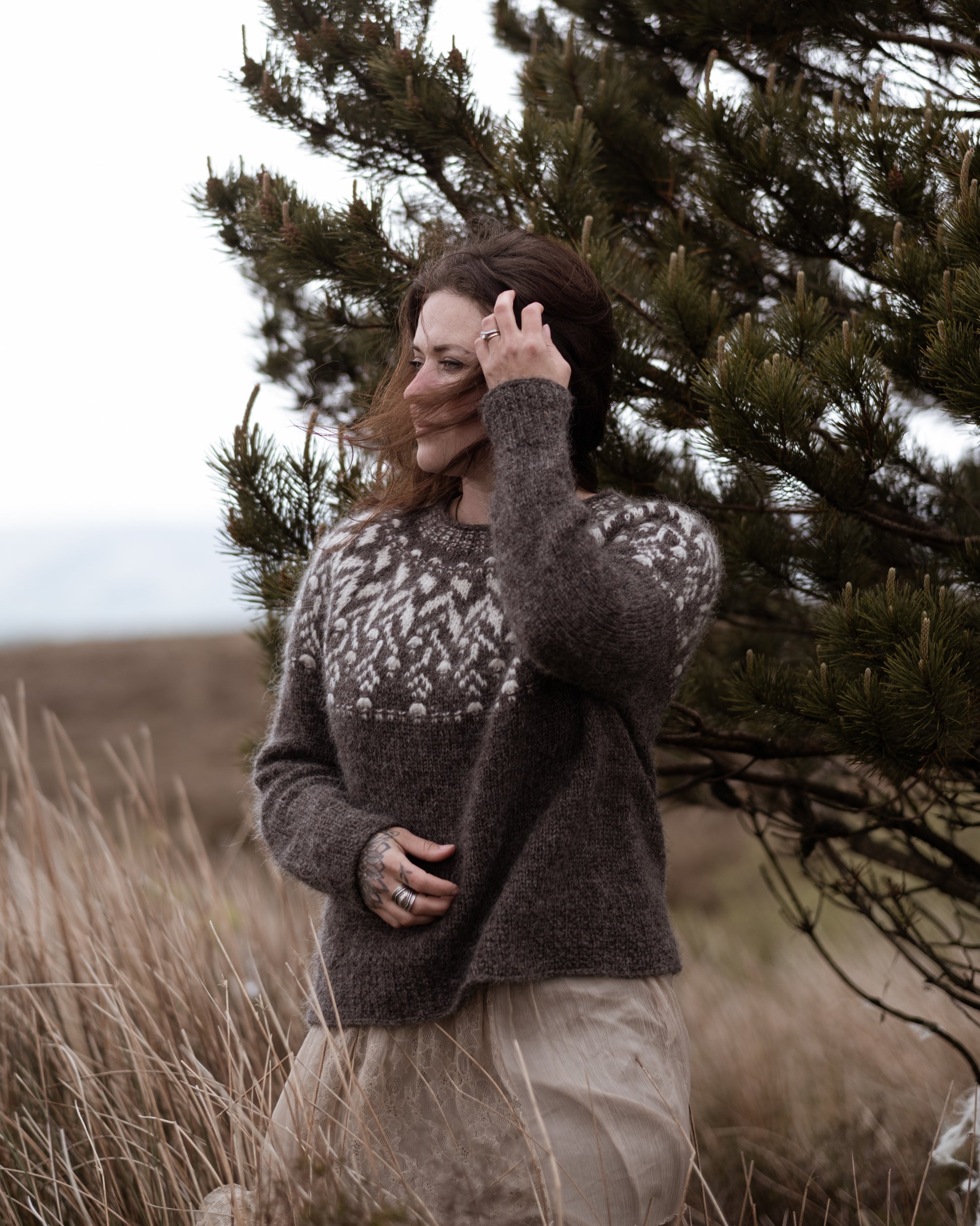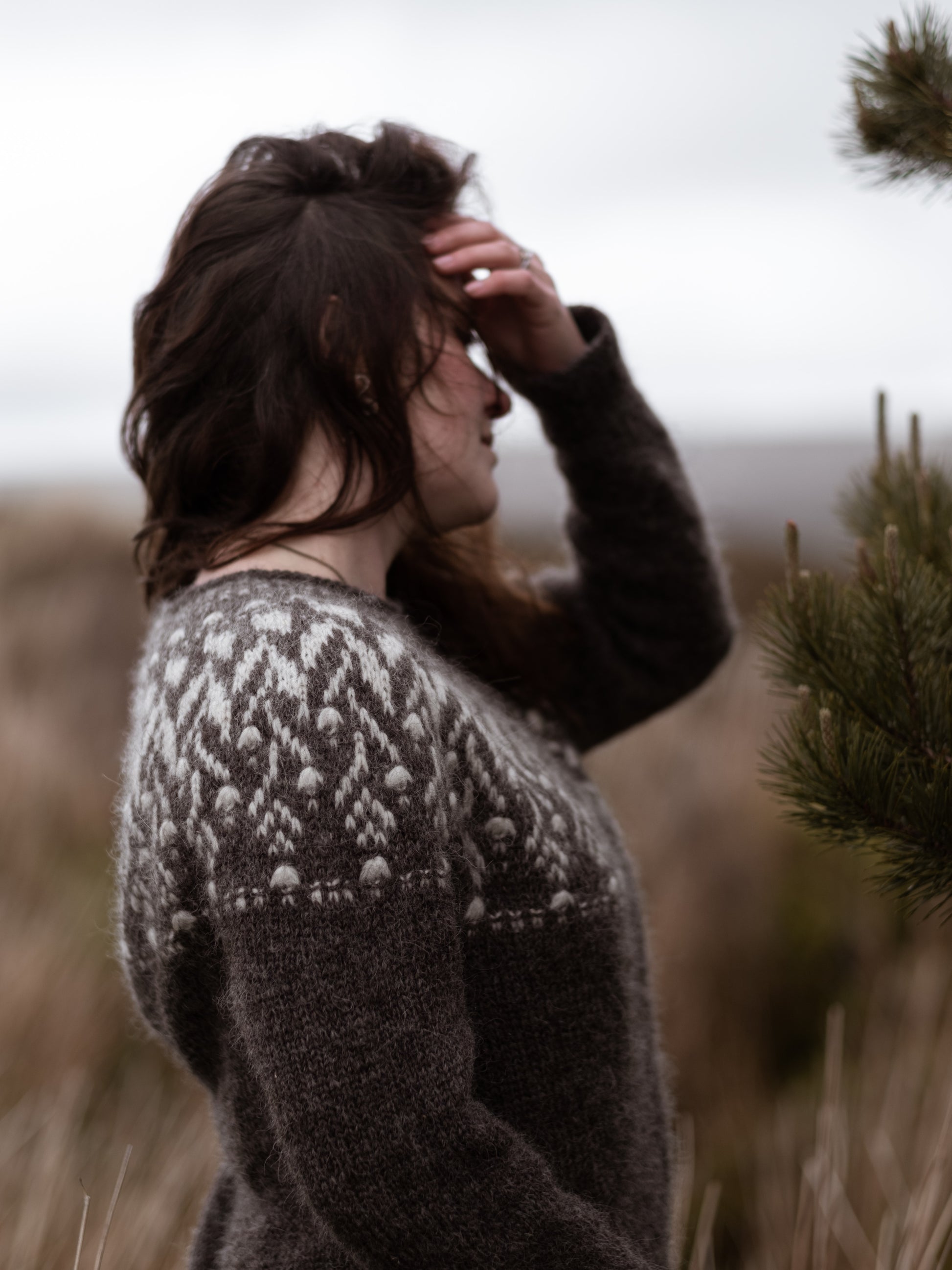 FROST FLOWERS is a stranded colourwork sweater with a top-down construction and a round yoke. Starting with the neck, the sweater is worked seamlessly top down. After the colourwork yoke, short rows are worked to shape the neckline and then the body and sleeves are separated while casting on stitches for underarms.