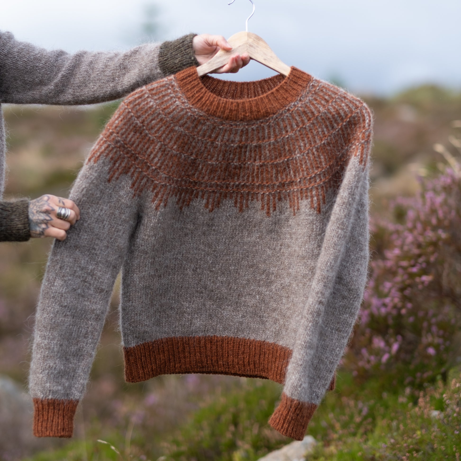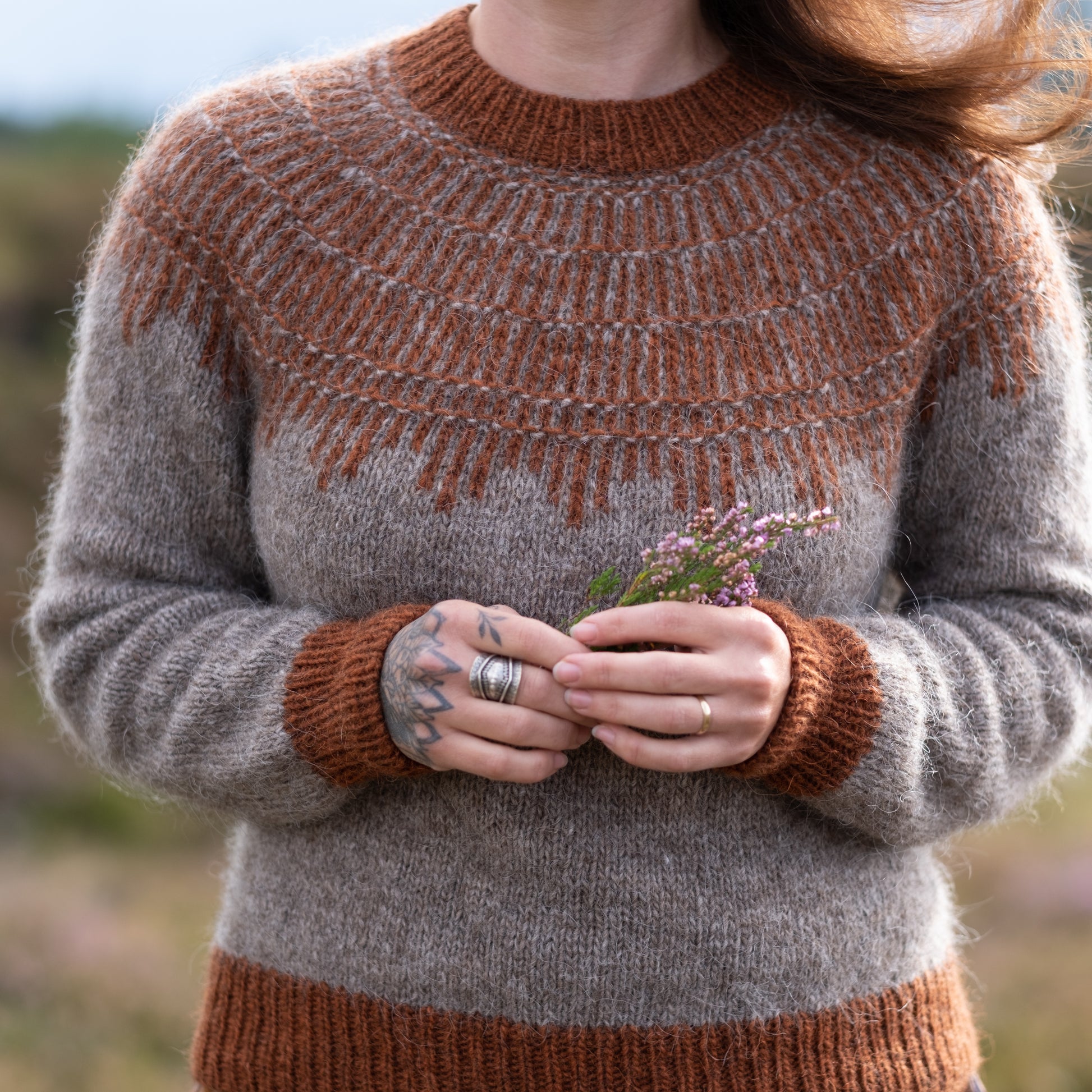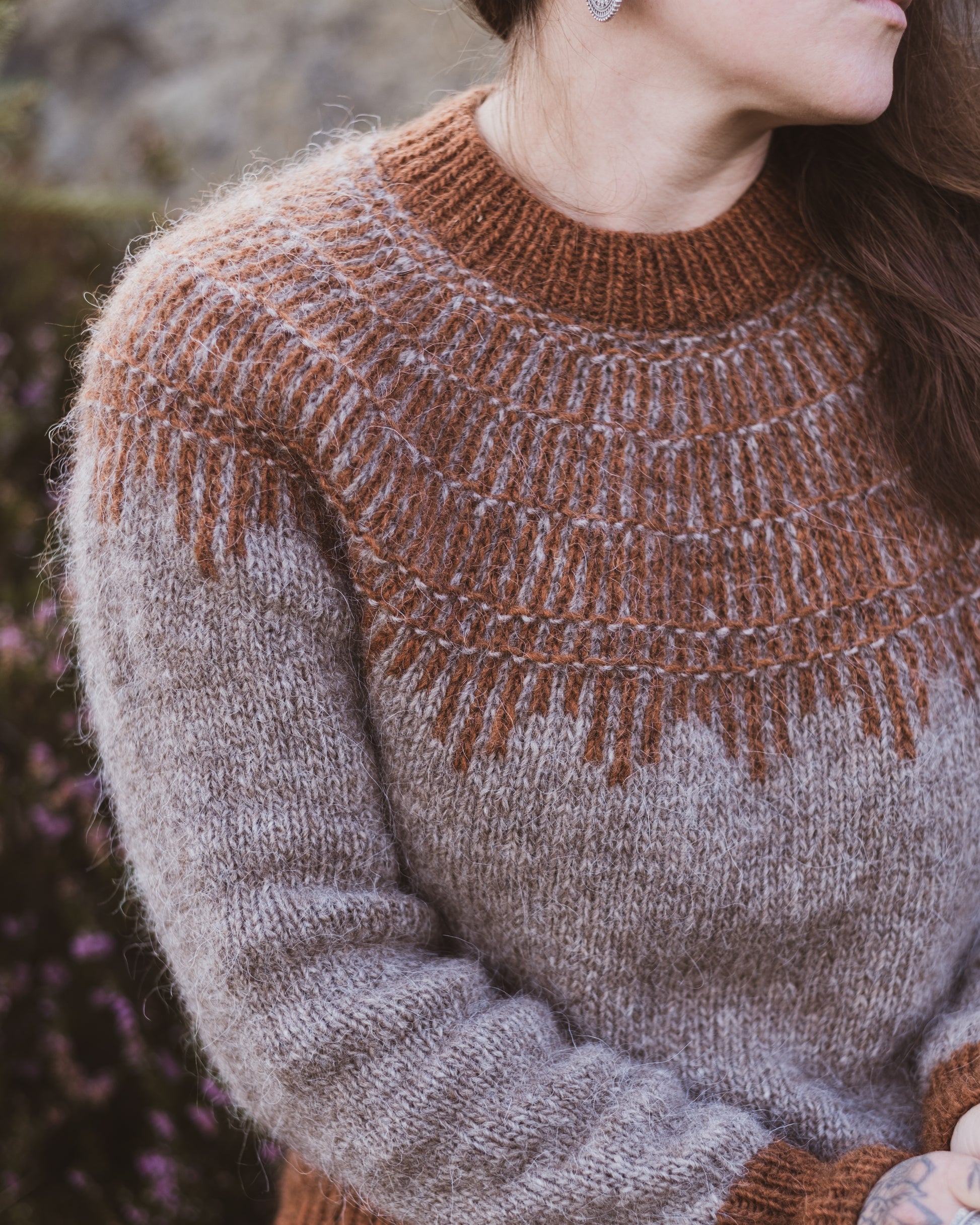 HEARTWOOD is a round yoke sweater with a top-down construction. The yoke design is achieved through a combination of very simple colourwork and texture stitches.