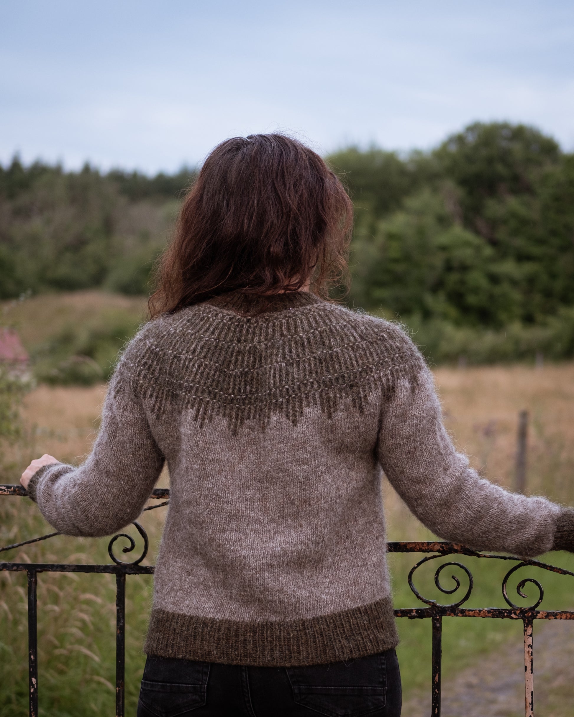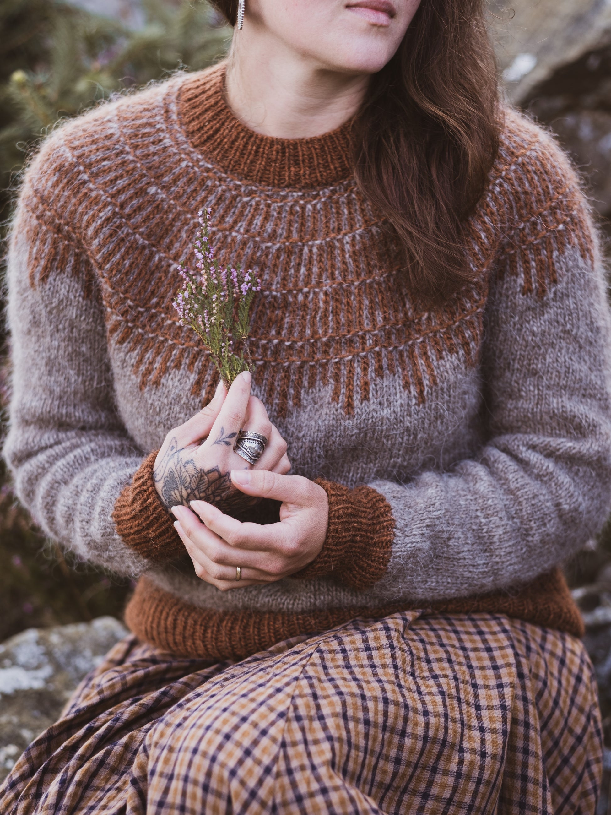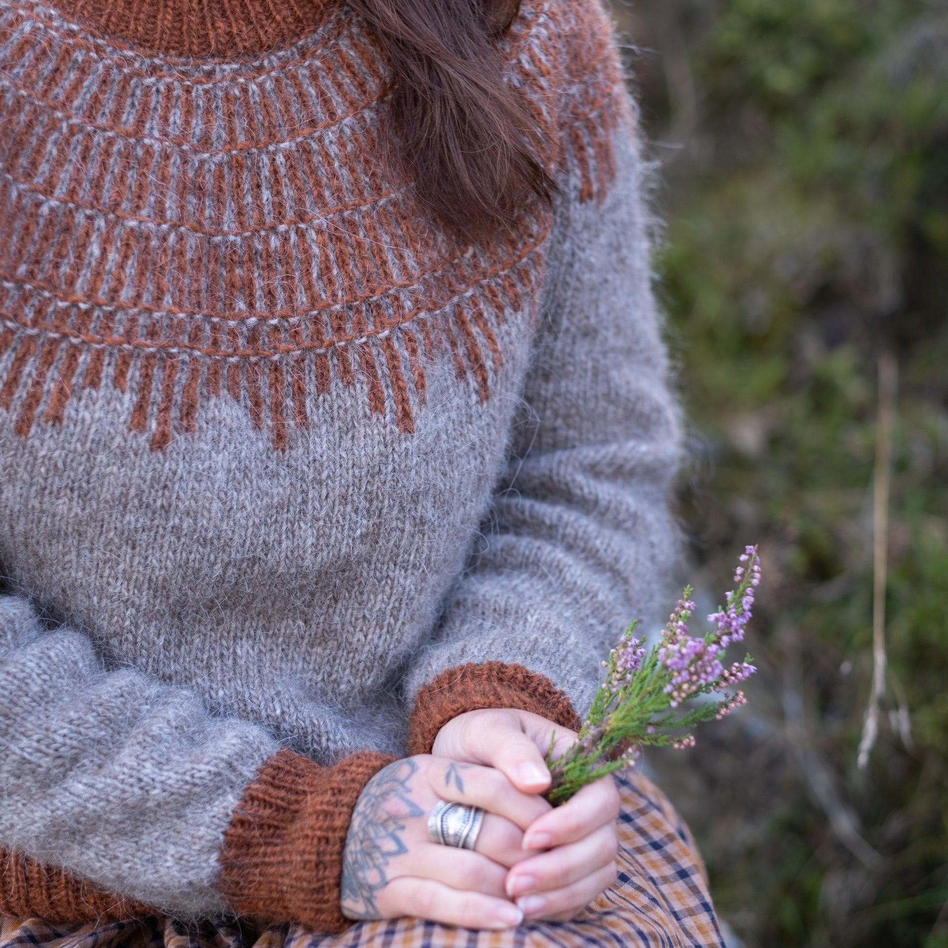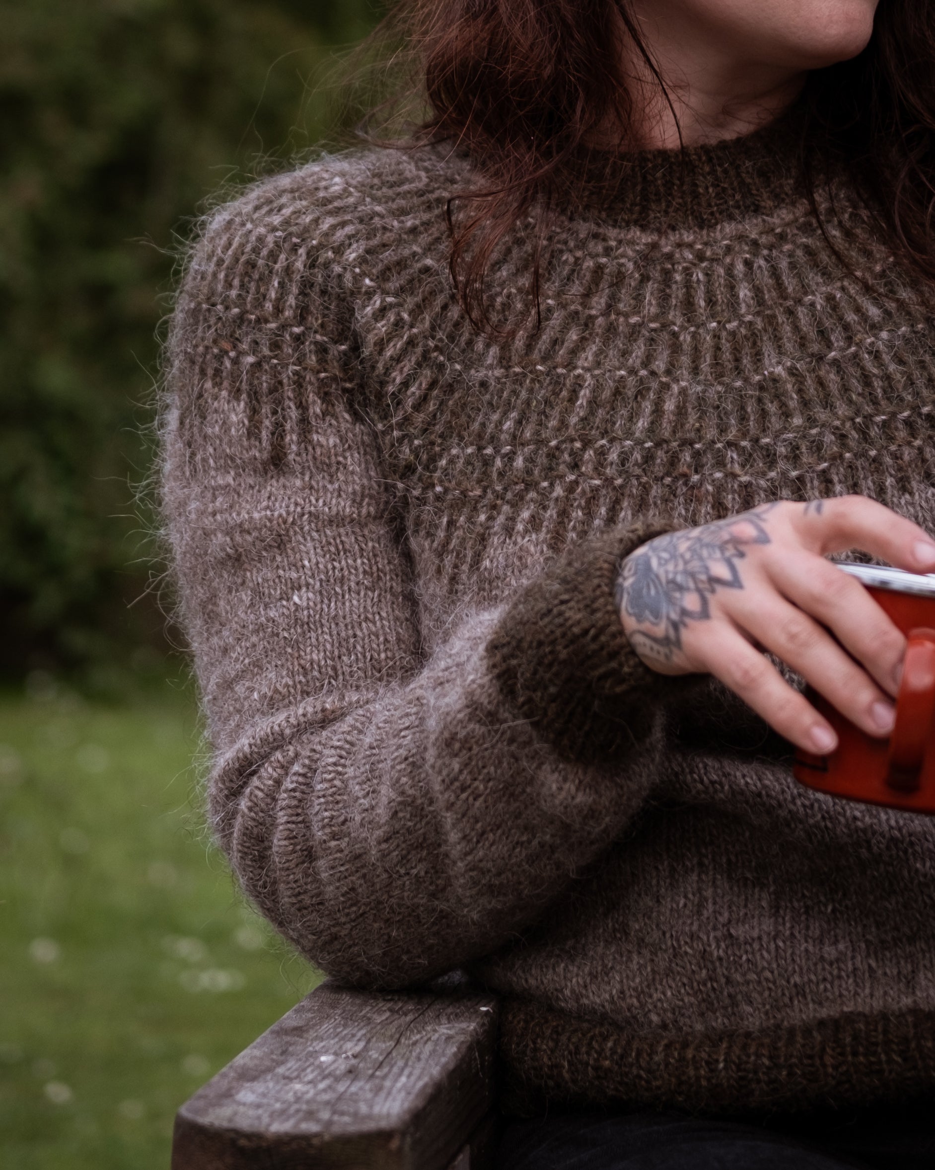 HEARTWOOD is a round yoke sweater with a top-down construction. The yoke design is achieved through a combination of very simple colourwork and texture stitches.