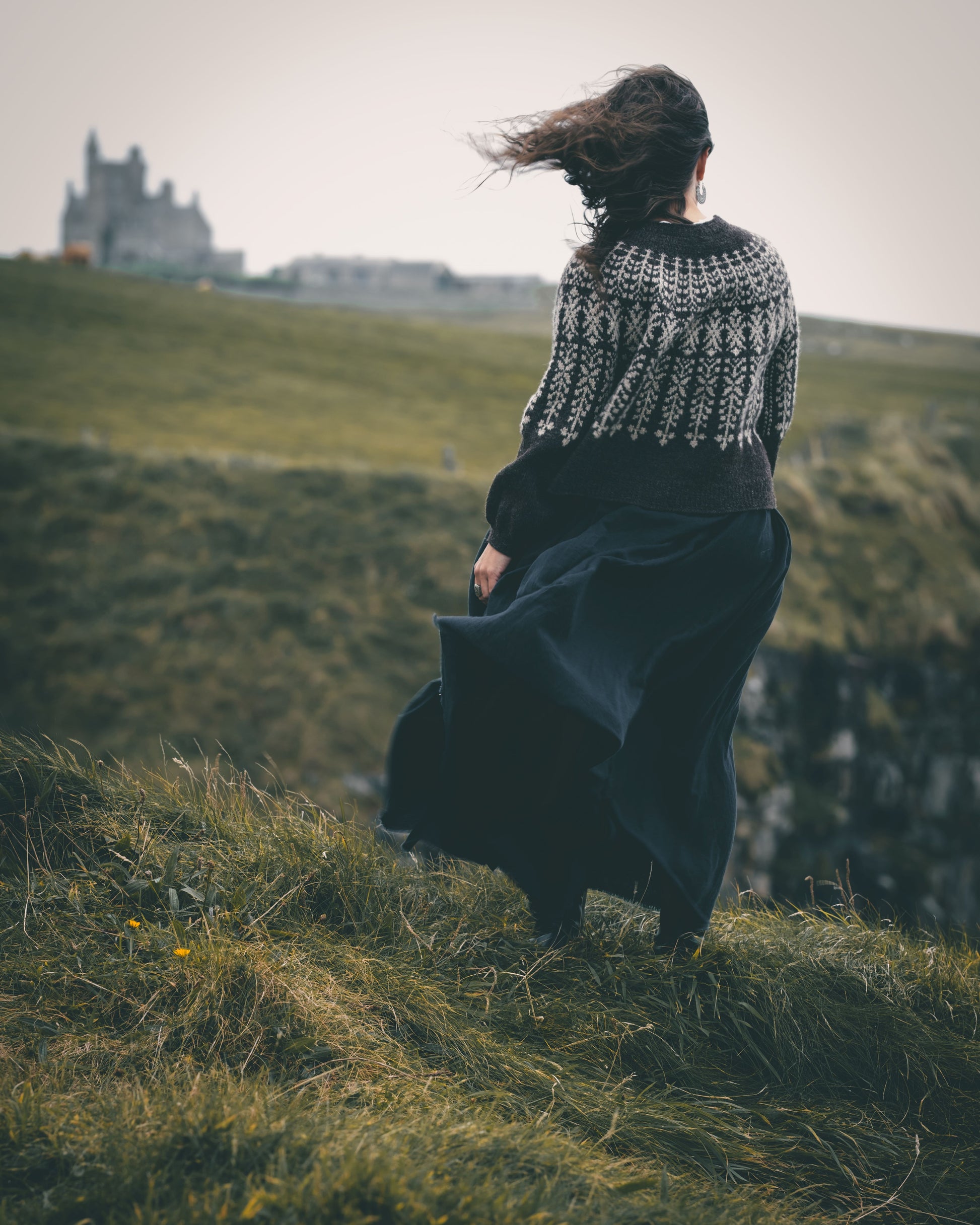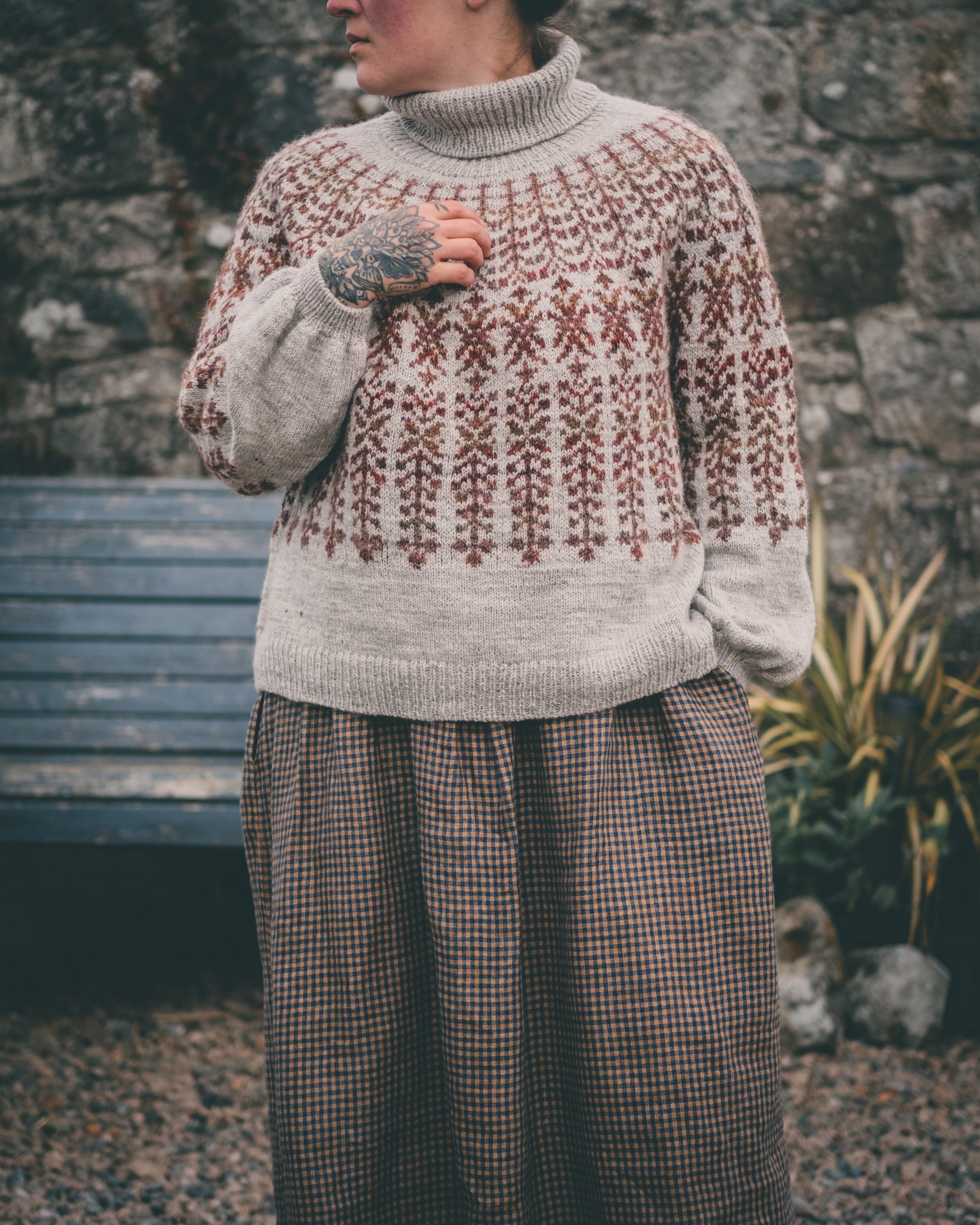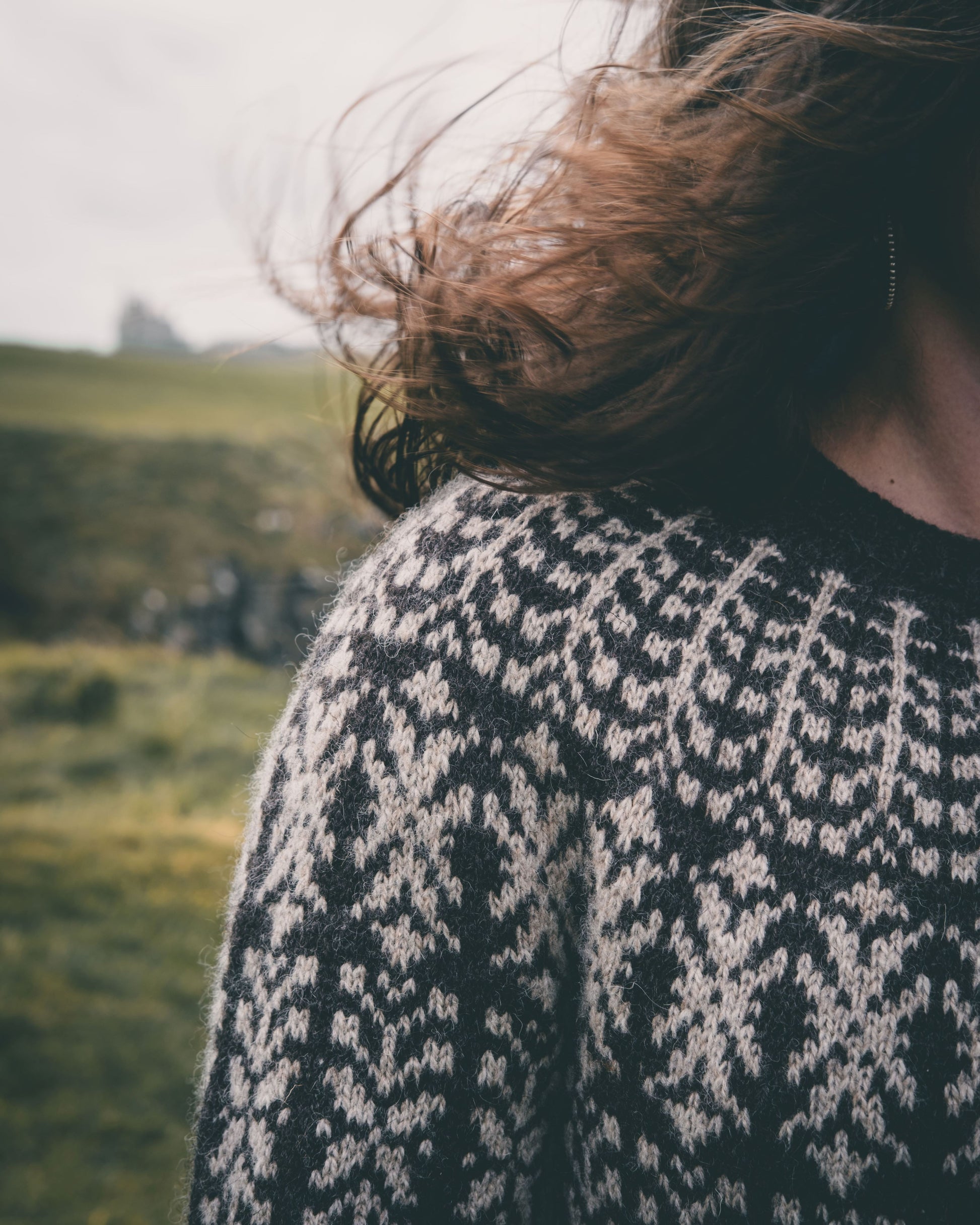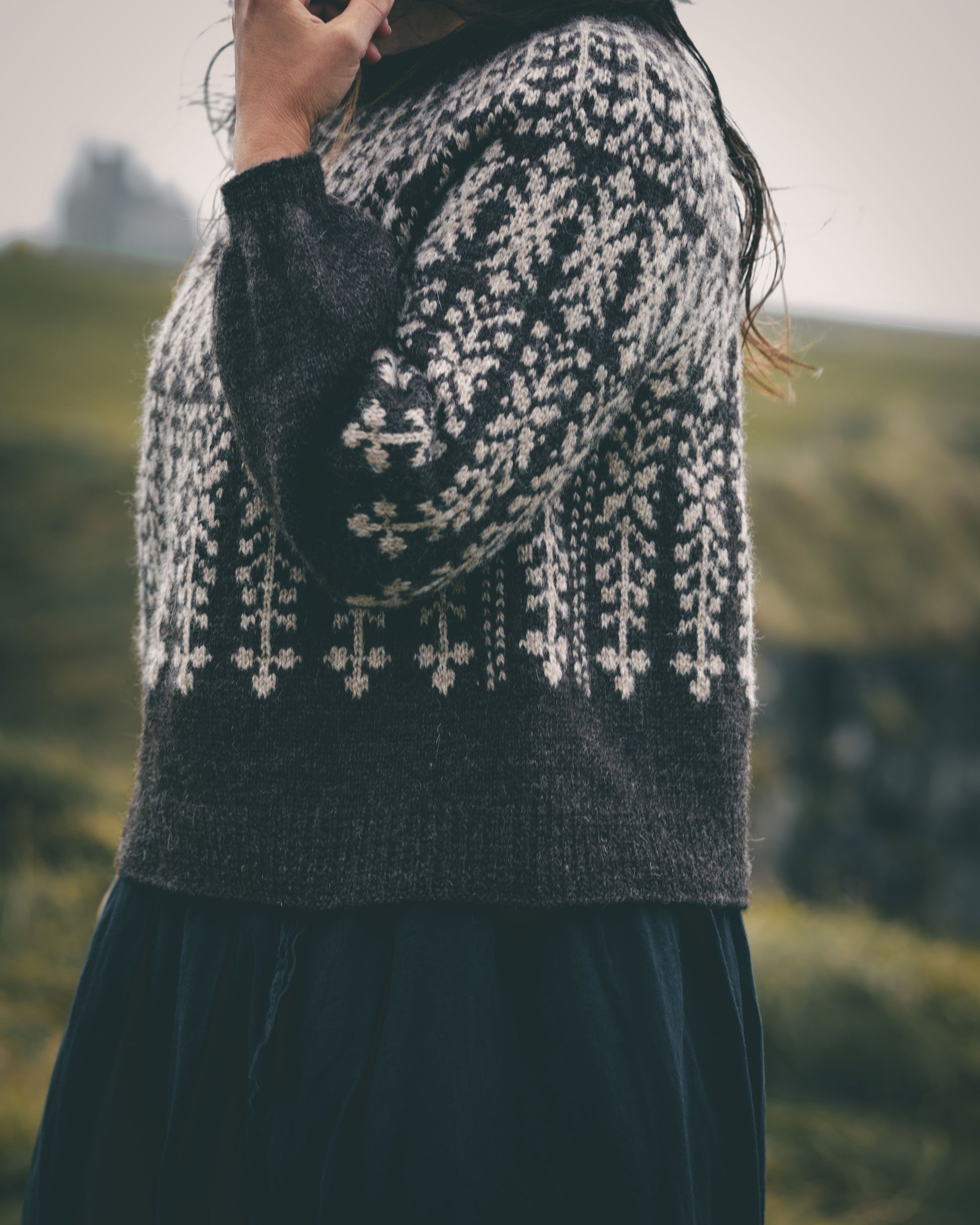 OBSIDIAN is a round yoke sweater with a top-down construction, relaxed boxy fit and colourwork on the yoke, body and sleeves. This pattern offers 2 options for the body and sleeve shaping: v1 with the A-line body and slightly exaggerated balloon sleeves and v2 with a straight body and balloon sleeves.