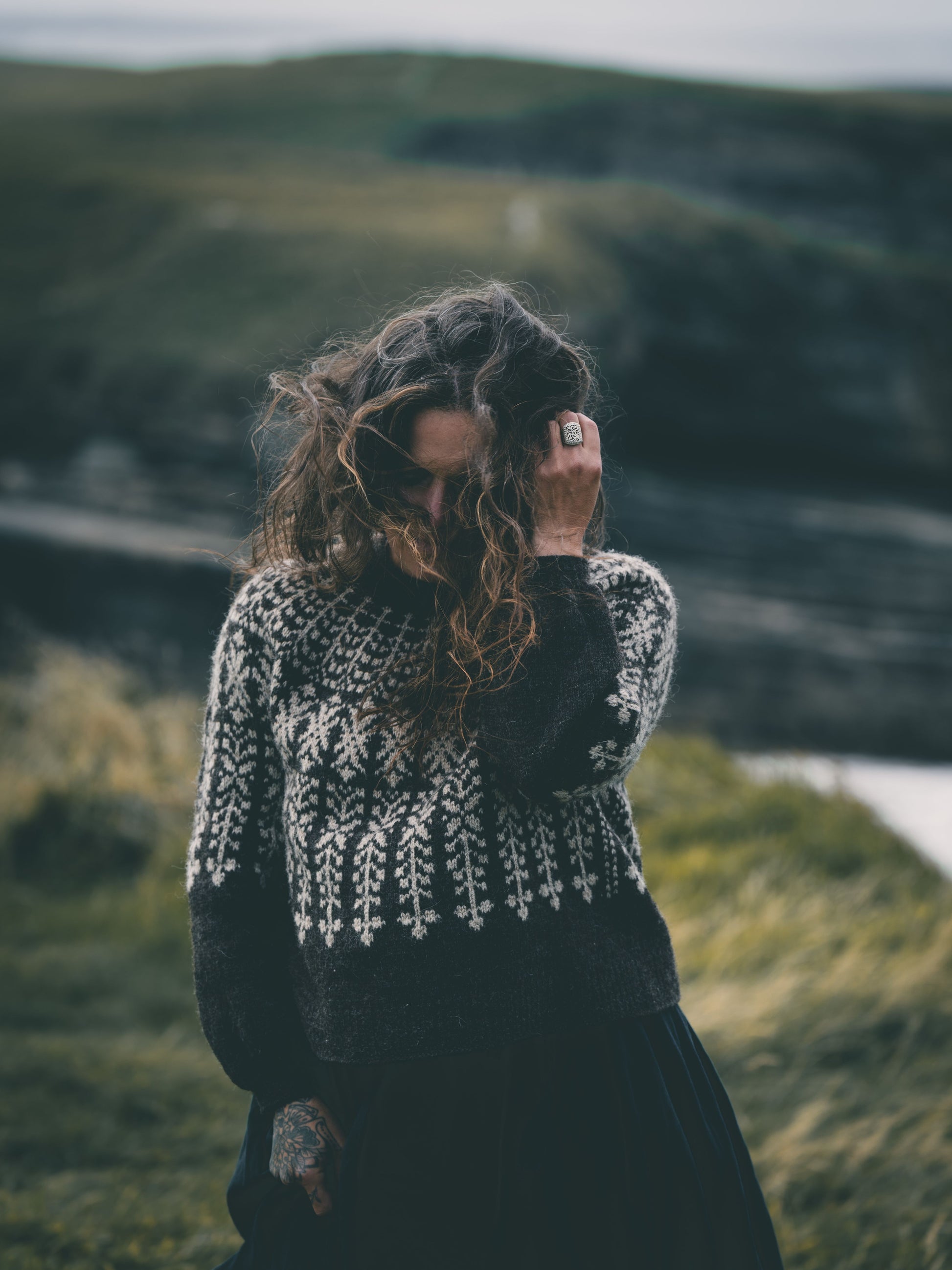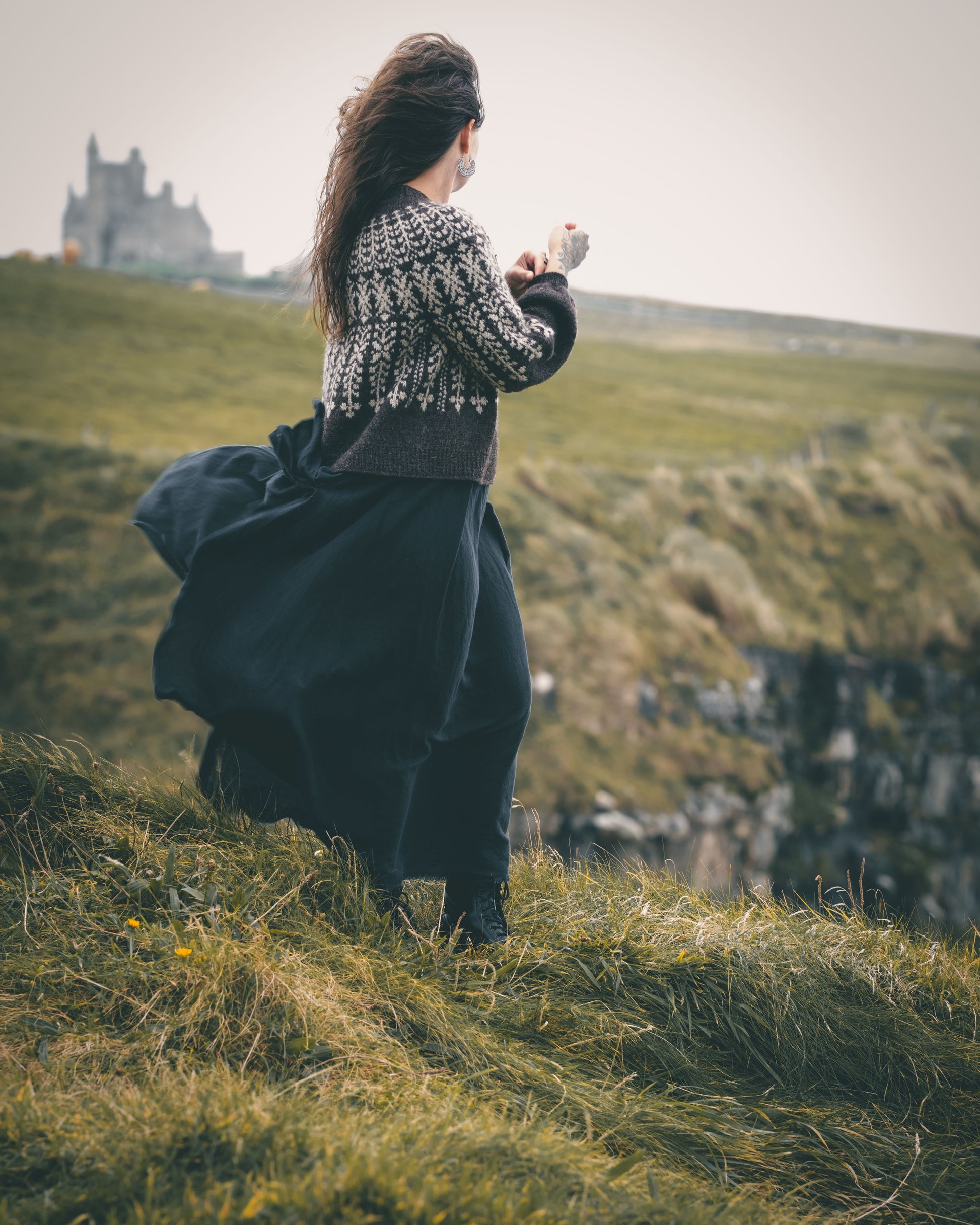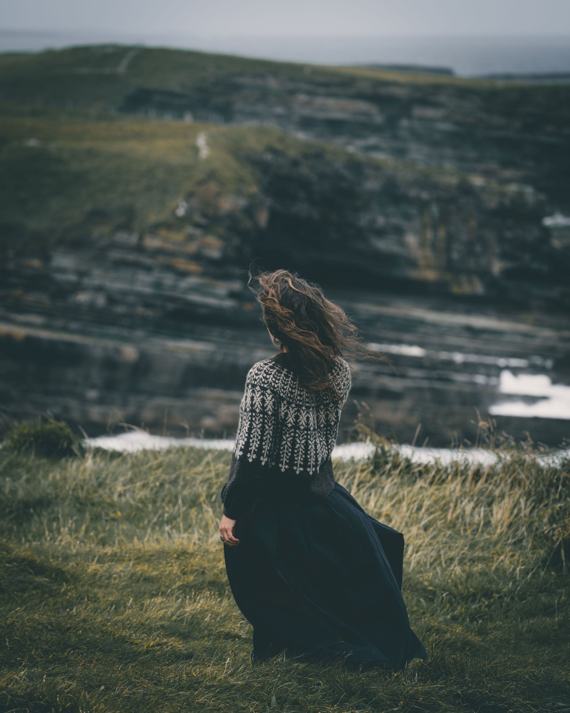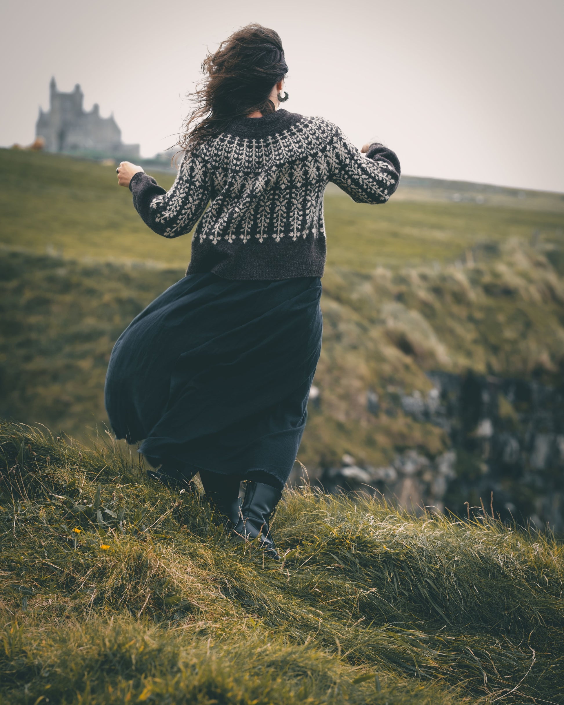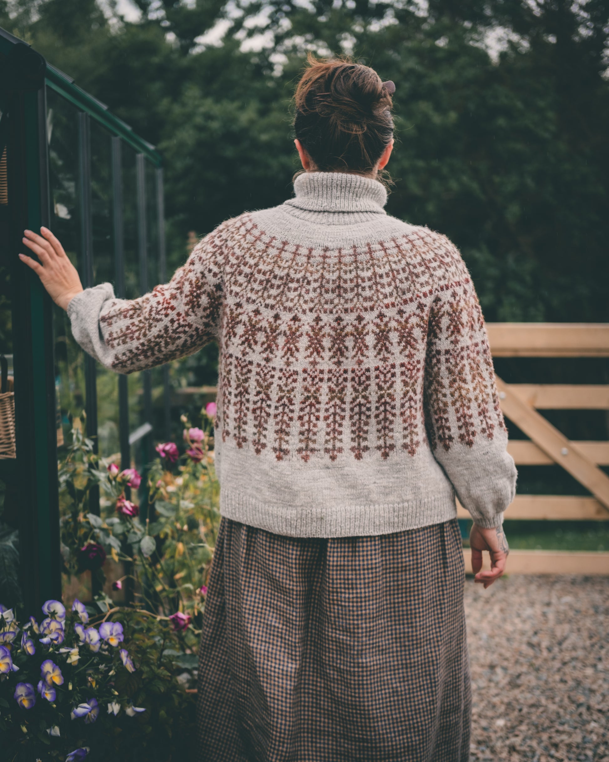 OBSIDIAN is a round yoke sweater with a top-down construction, relaxed boxy fit and colourwork on the yoke, body and sleeves. This pattern offers 2 options for the body and sleeve shaping: v1 with the A-line body and slightly exaggerated balloon sleeves and v2 with a straight body and balloon sleeves.
