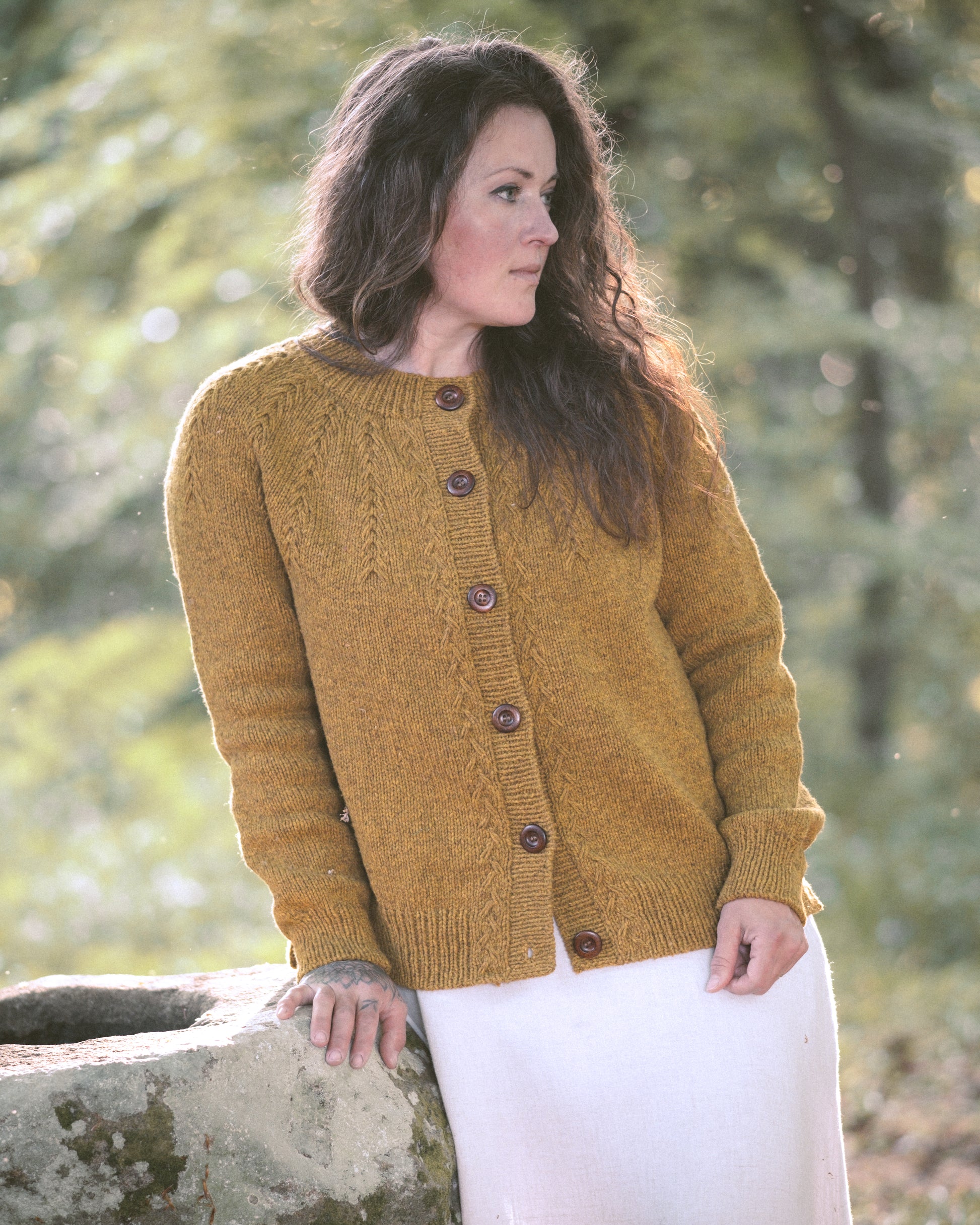 THERE AND BACK AGAIN CARDIGAN is a round yoke cardigan with a top-down construction, worked flat. The cardigan features a simple elongated stitch motif around the yoke, and a similar motif running along the button band and sides of the cardigan. Starting with casting on for the yoke, this cardigan is worked seamlessly top down, using short rows to shape the neckline. After the yoke, the body and sleeves are separated while casting on stitches for the underarms, and then the body is worked flat while the sleeve are worked in the round.