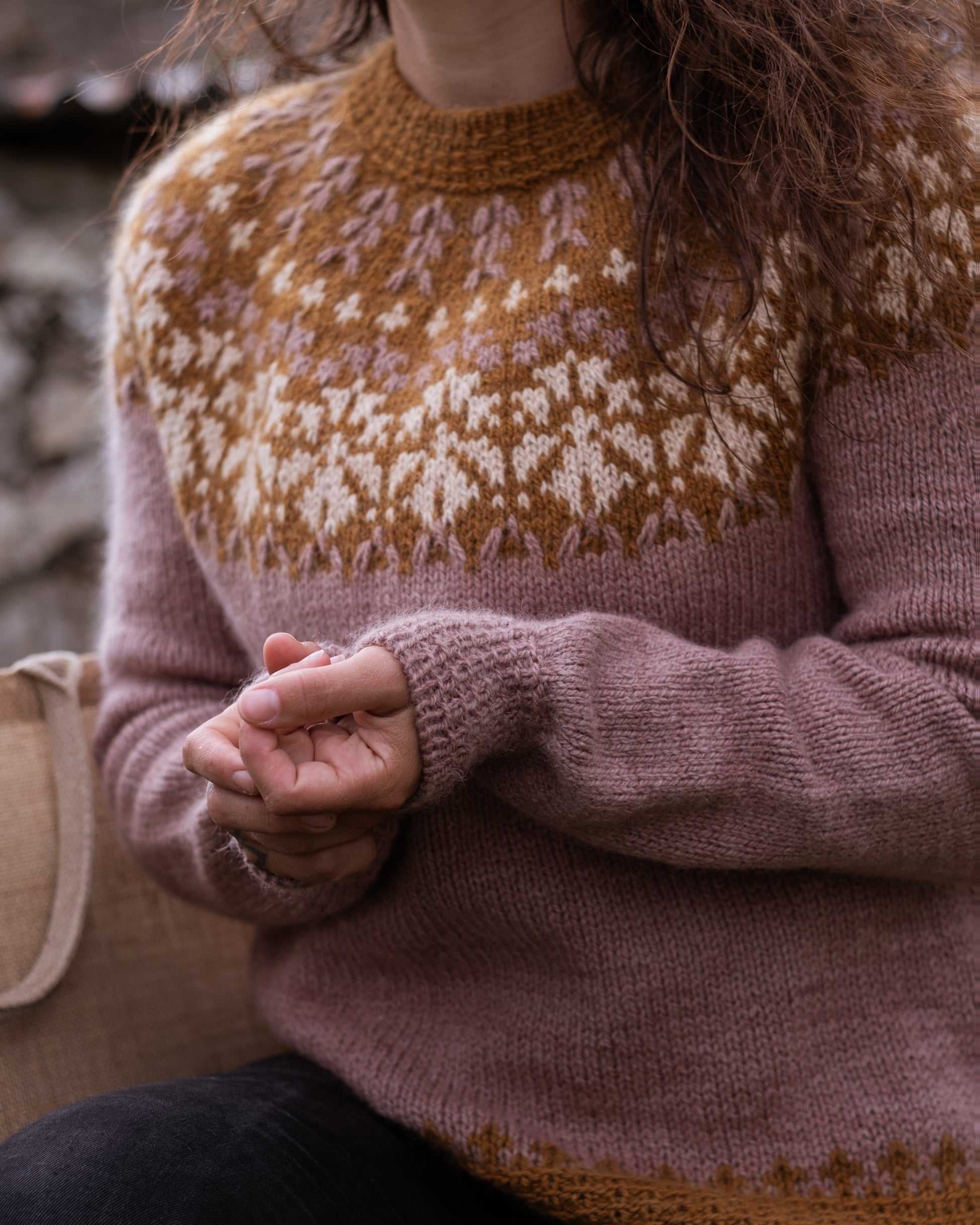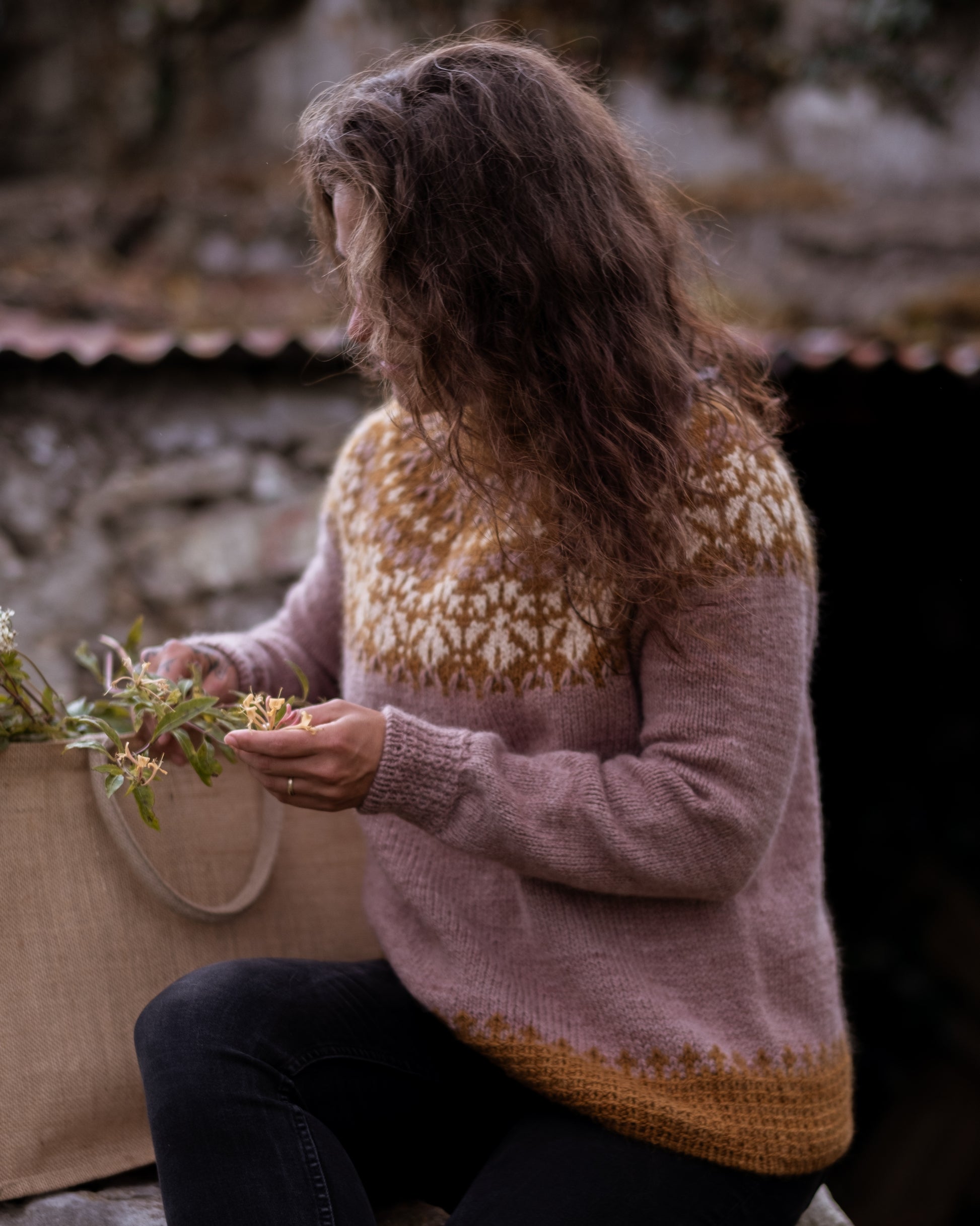 WOODBINE is a stranded colourwork sweater with a top-down construction, colourwork round yoke and textured ribbing. Starting with cast on for the neck ribbing, the sweater is worked seamlessly top down, using short rows to shape the neckline. After the yoke, the body and sleeves are separated while casting on stitches for the underarms, and then worked separately in the round.
